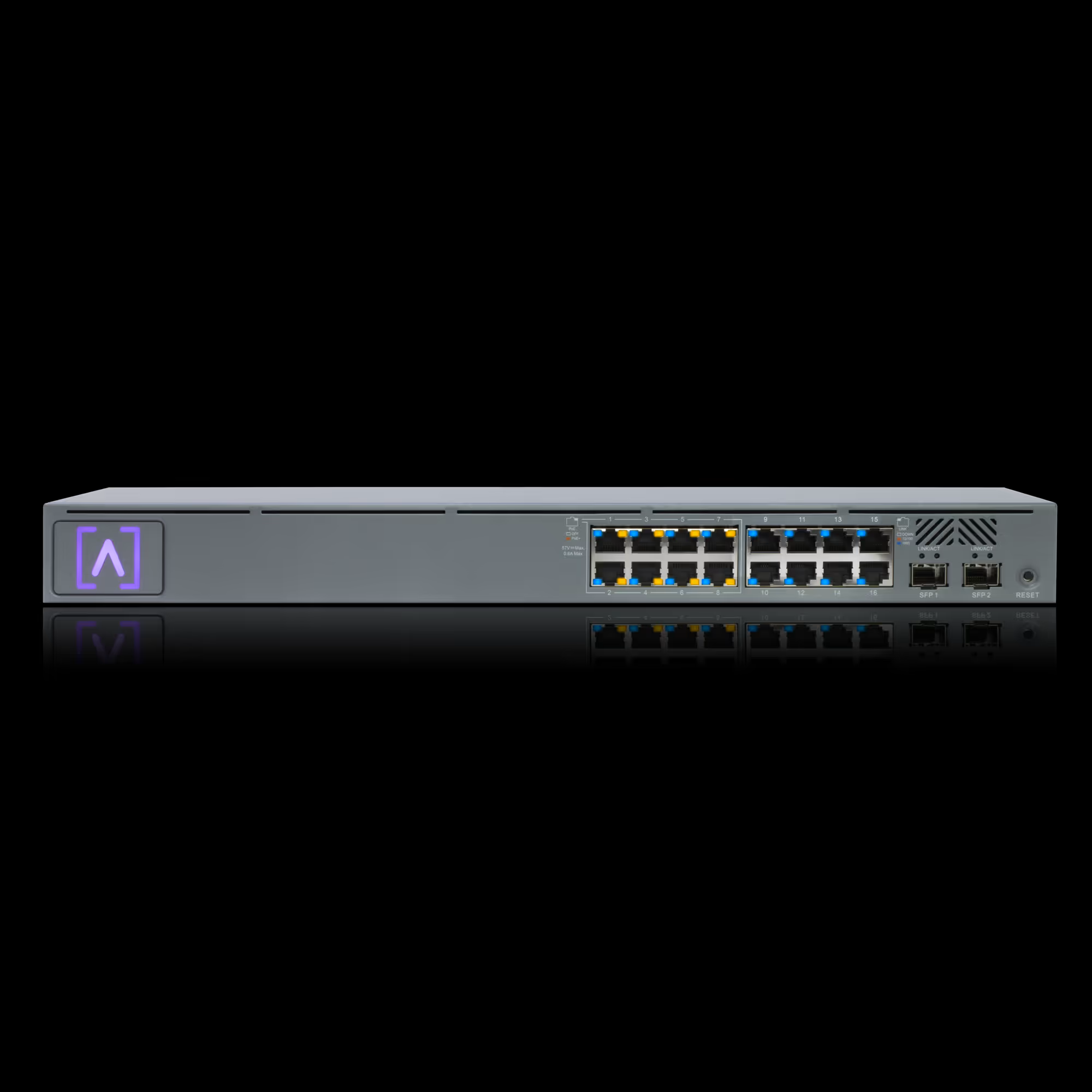 The S16‑PoE is a rack mountable switch with sixteen 10/100/1000 ports, eight of which support PoE+.
